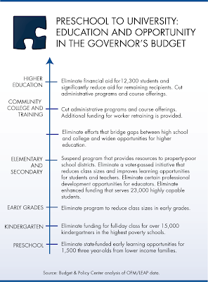 Today the Budget & Policy Center is releasing an analysis of Governor Gregoire's supplemental budget for the FY09-11 biennium. For the second year in a row, the Governor’s budget proposes deep cuts to core public services in response to the continuing economic and fiscal crisis in the state. Combined with the cuts already enacted in the current biennium, the Governor’s supplemental budget proposal would result in a nearly 14 percent reduction in the state’s investments in education, health care, and economic security.